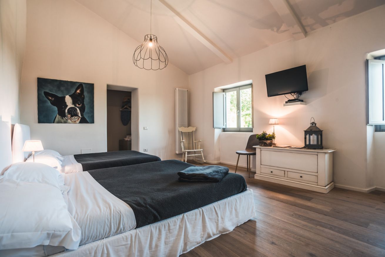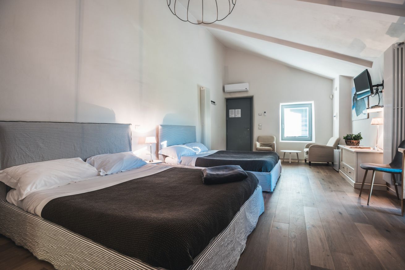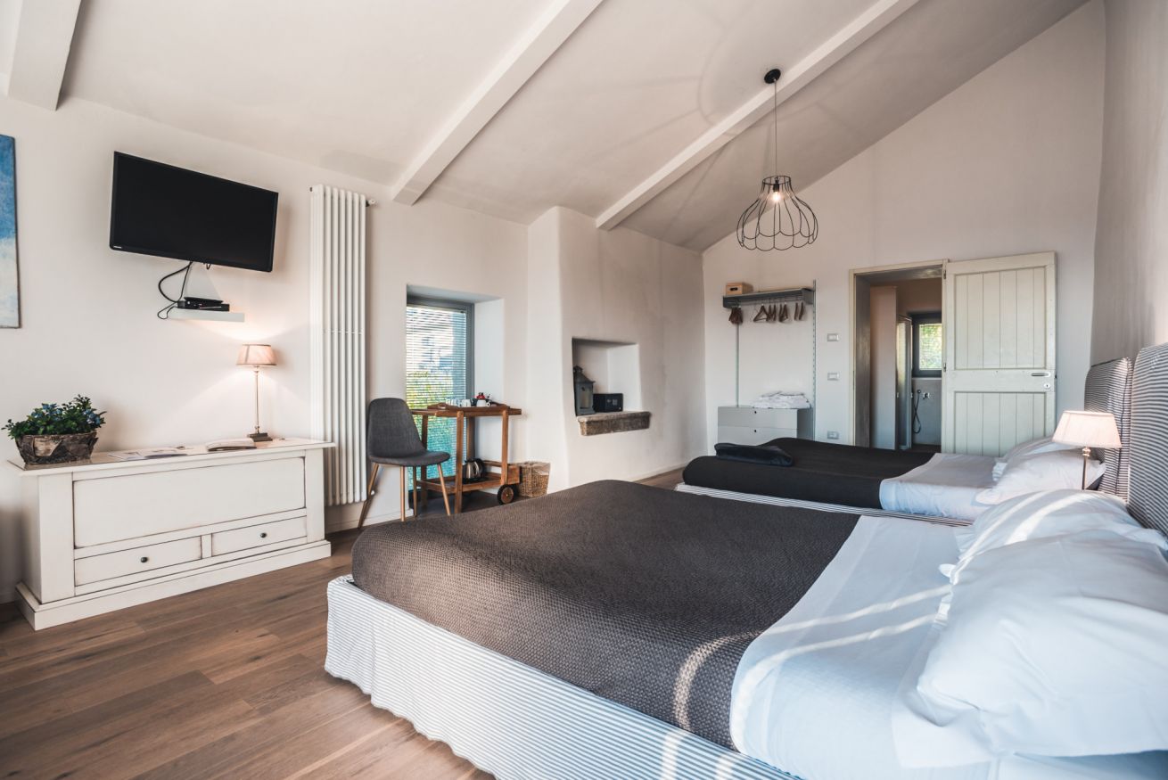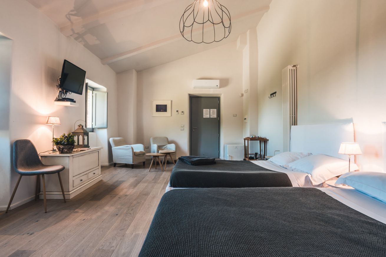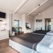 30 square meter quadruple room, open-space with 2 double beds for 4 adults, large bathroom with shower cabin, shared outdoor patio, air conditioning, bathroom with shower cabin, TV, and in-room safe.