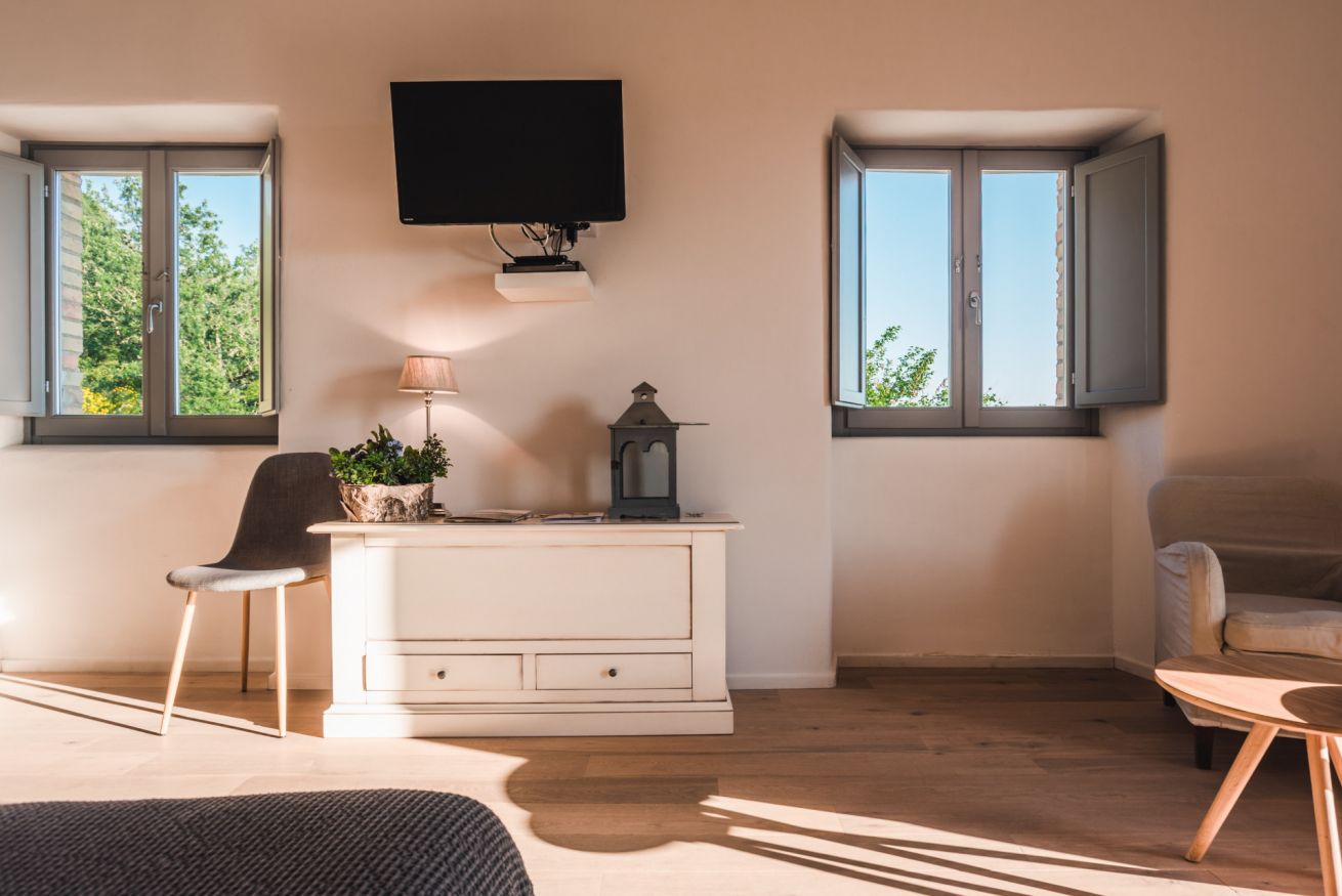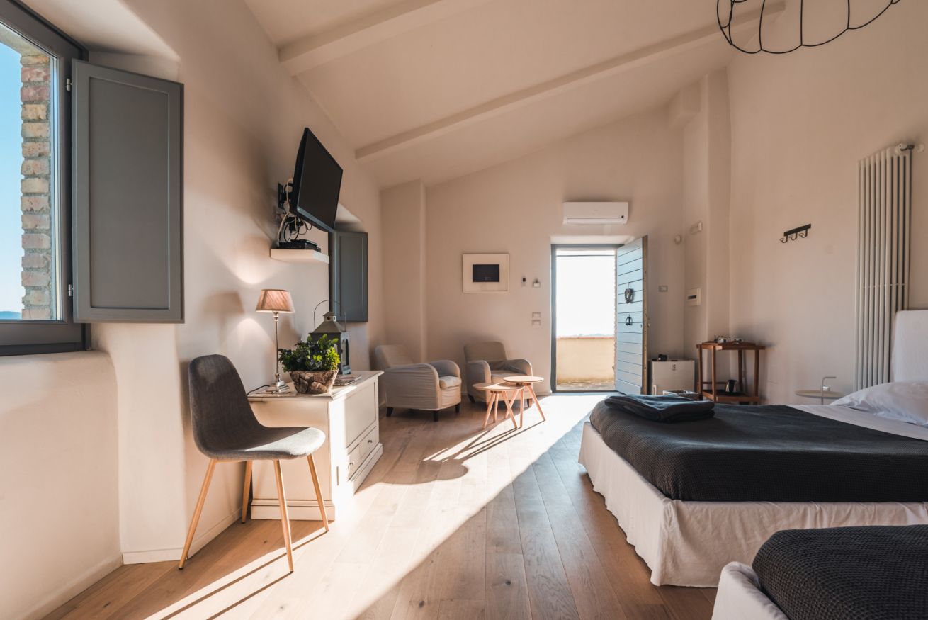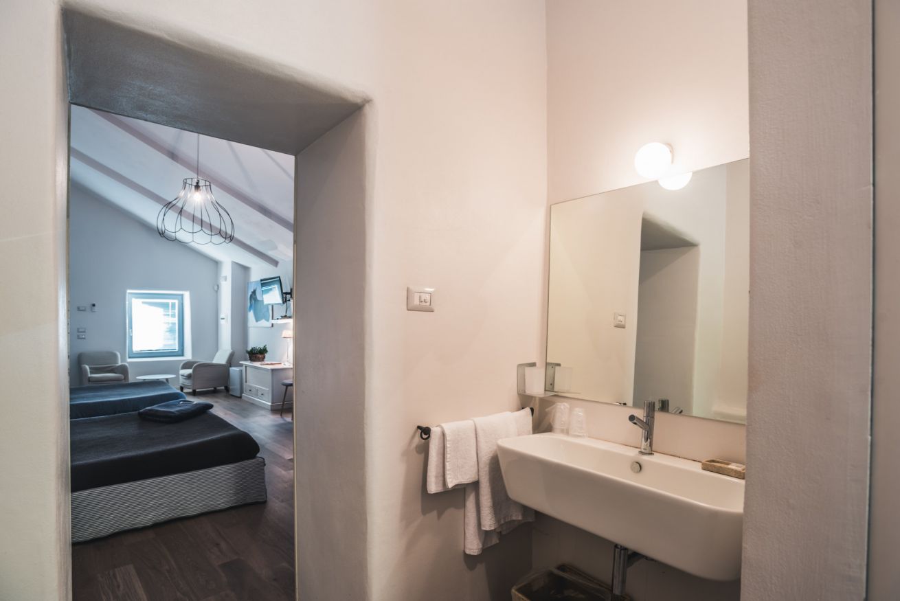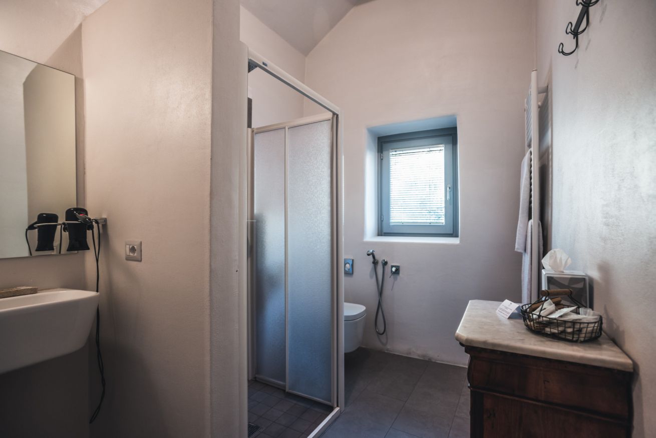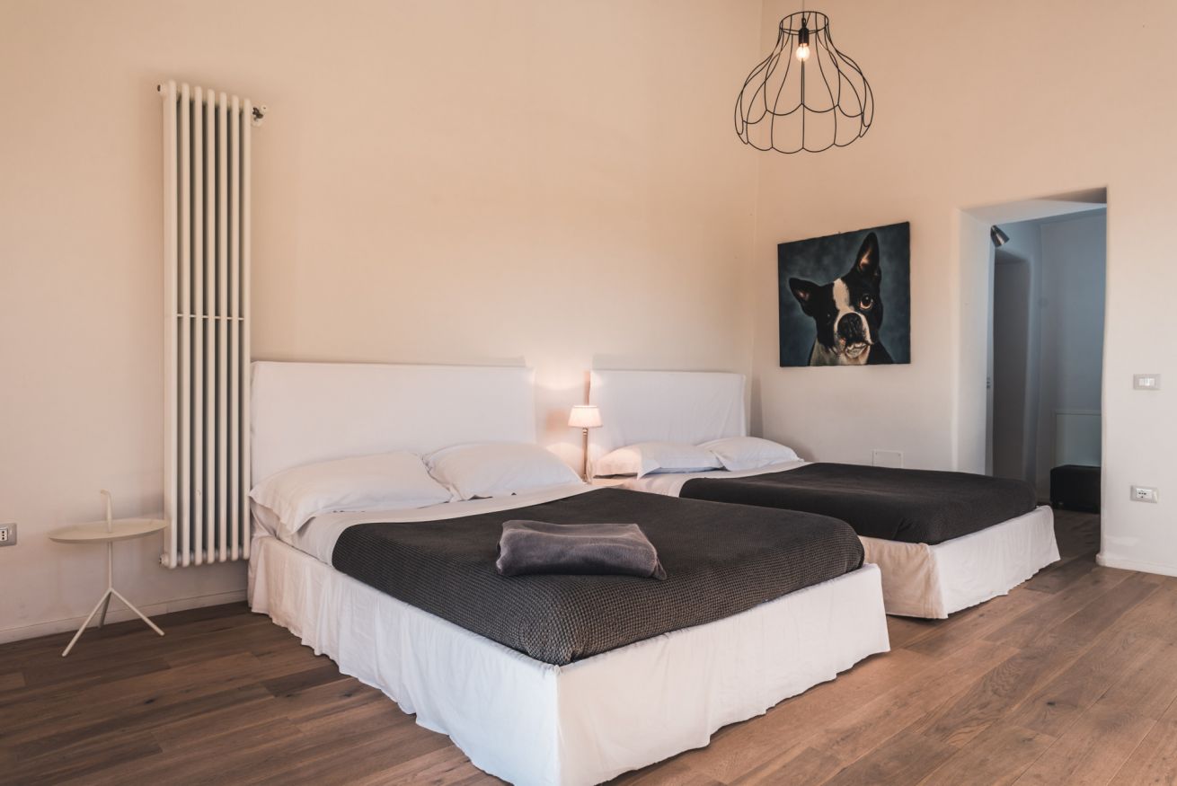 30 square meter quadruple room, open-space with 2 double beds for 4 adults, large bathroom with shower cabin, shared outdoor patio, air conditioning, bathroom with shower cabin, TV, and in-room safe.