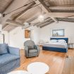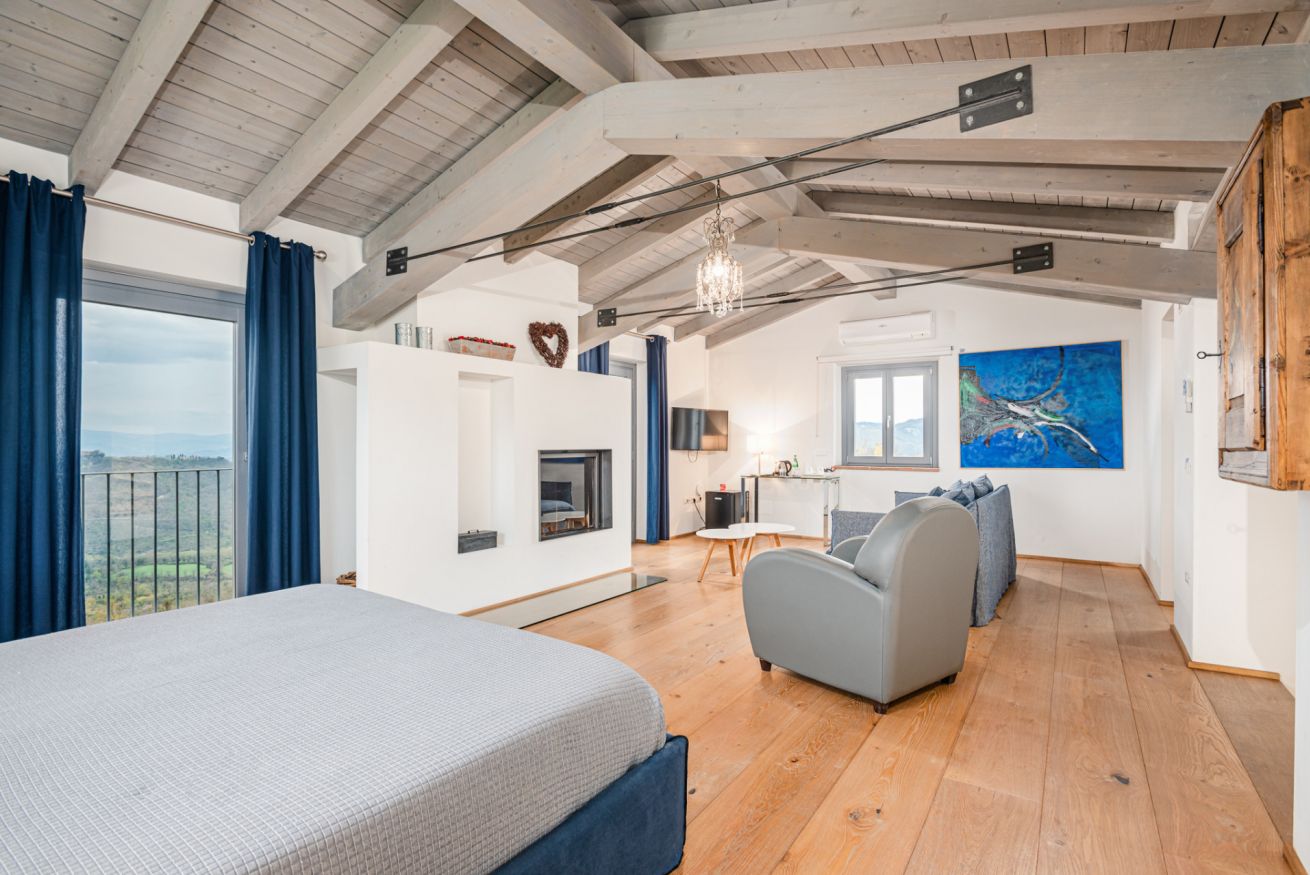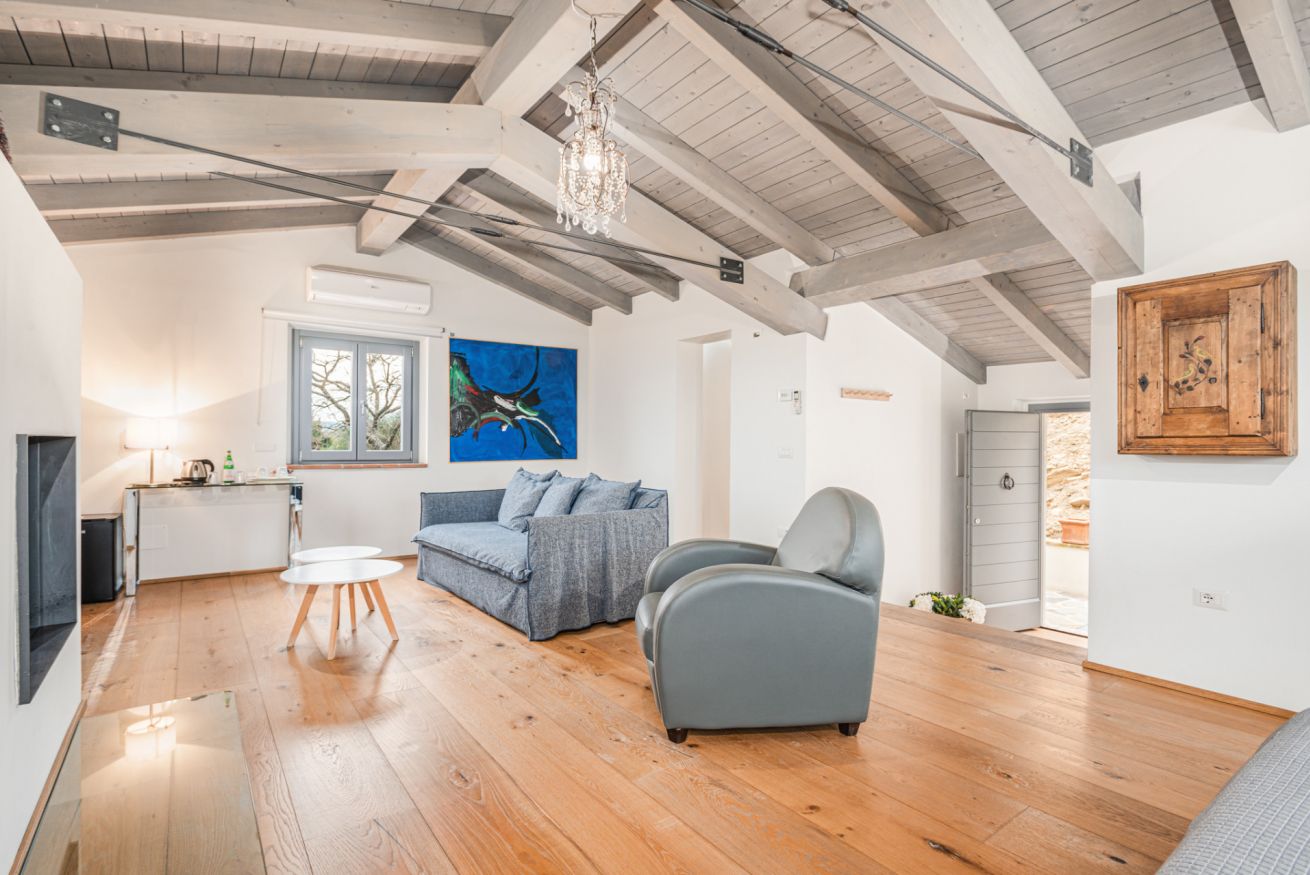 Approximately 35 sqm Suite consisting of a double/twin room, living room with a double sofa bed for a total of 4 adults, bathroom with shower cabin, air conditioning, and fireplace.
