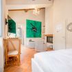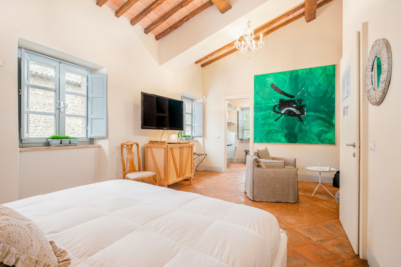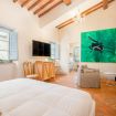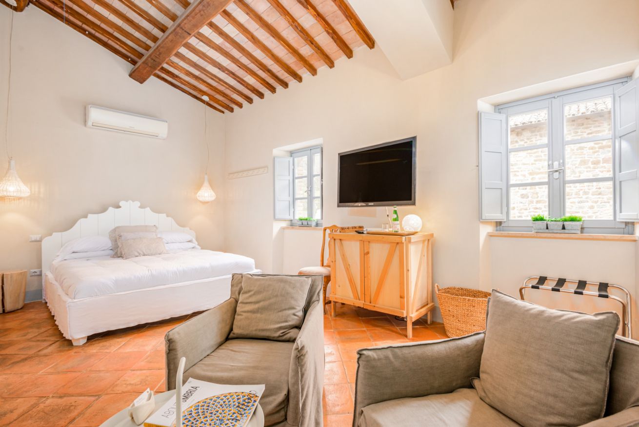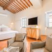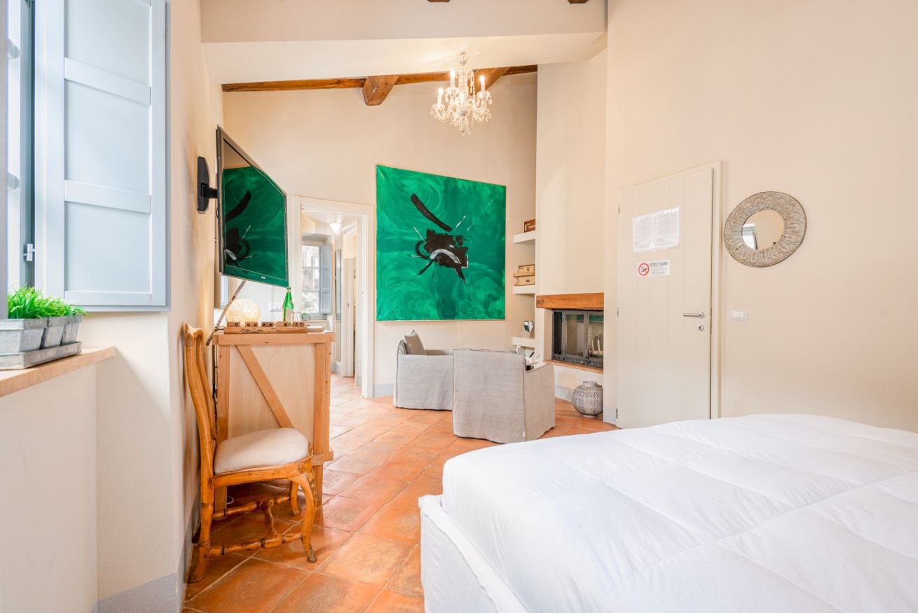 35 sqm suite, double bed for up to 2 people, living room with fireplace and large bathroom with shower cabin, air conditioning, underfloor heating, TV with Sky Vision Gold, and in-room safe.